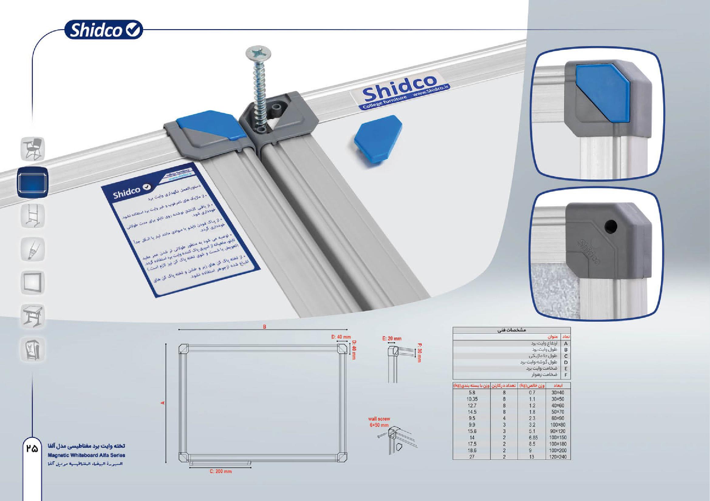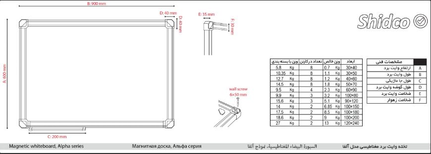 تخته وایت برد مغناطیسی شیدکو مدل آلفا ابعاد 90*60